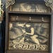 Wooden shelf, decorated with aged paper and metal corners. Ideal to create your small Cabinet of Curiosities. This model also adds some hooks so you can hang your keys with style.