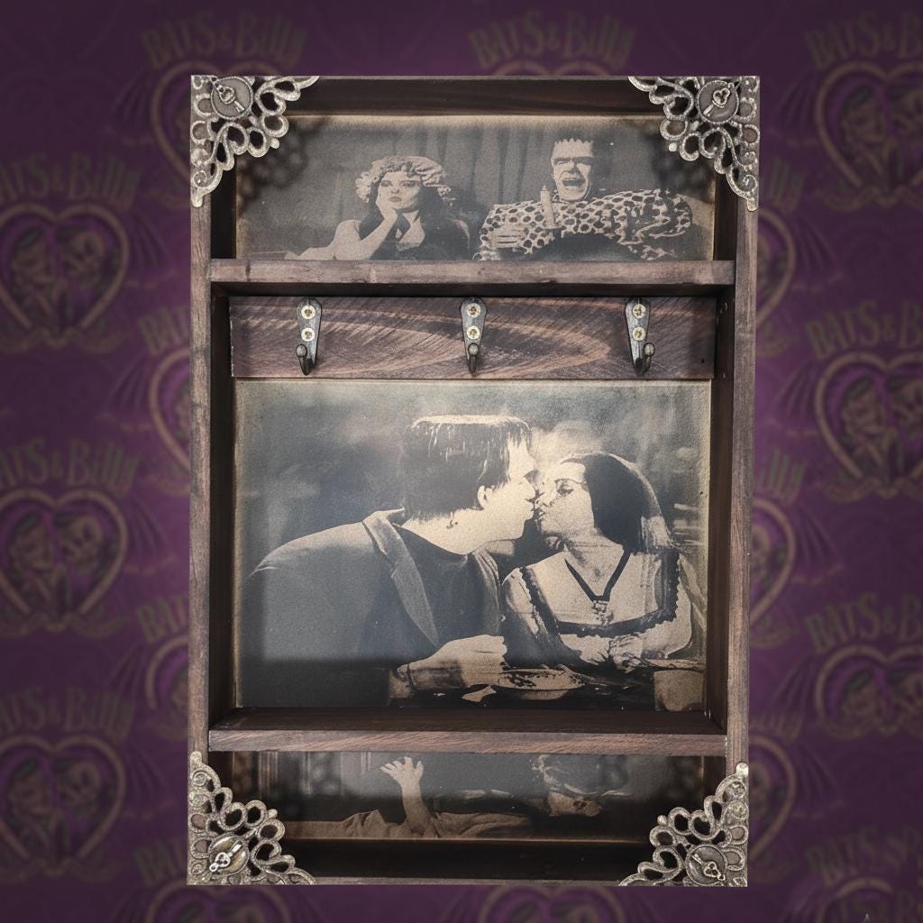 Wooden shelf, decorated with aged paper and metal corners. Ideal to create your small Cabinet of Curiosities. This model also adds some hooks so you can hang your keys with style.